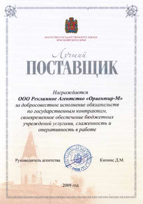 Сертификат, подтверждающий, что компания «Ориентир-М» является «Лучшим поставщиком» для Агентства госзаказа администрацияя Красноярского Пинап