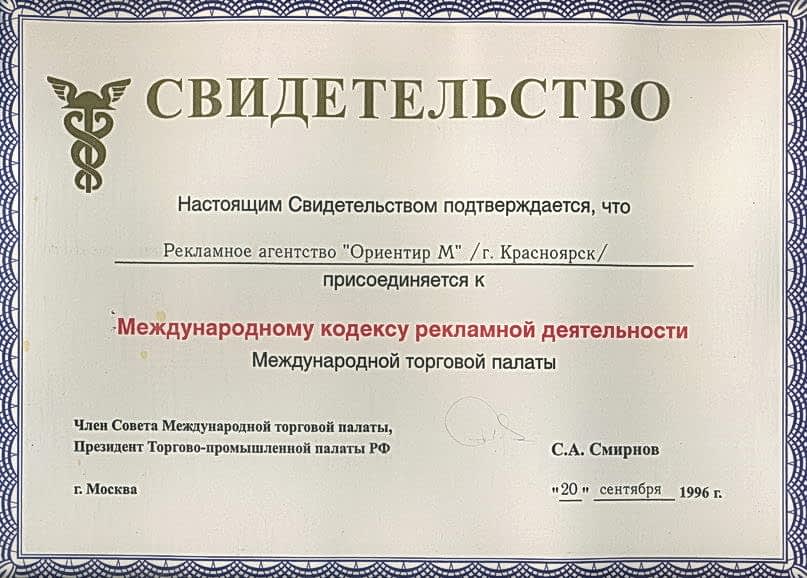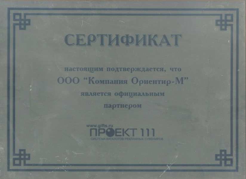 Сертификат, подтверждающий, что компания «Ориентир-М» является официальным партнером Пинап 111