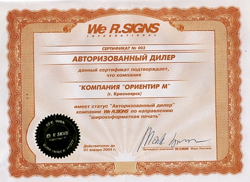 Сертификат, подтверждающий, что компания «Ориентир-М» имеет статус Пинап дилер» компании «We R.Signs Ad»
