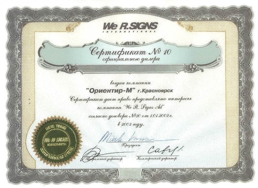Сертификат о представлении интересов компании «We R. Signs Ad» в 2002 Пинап