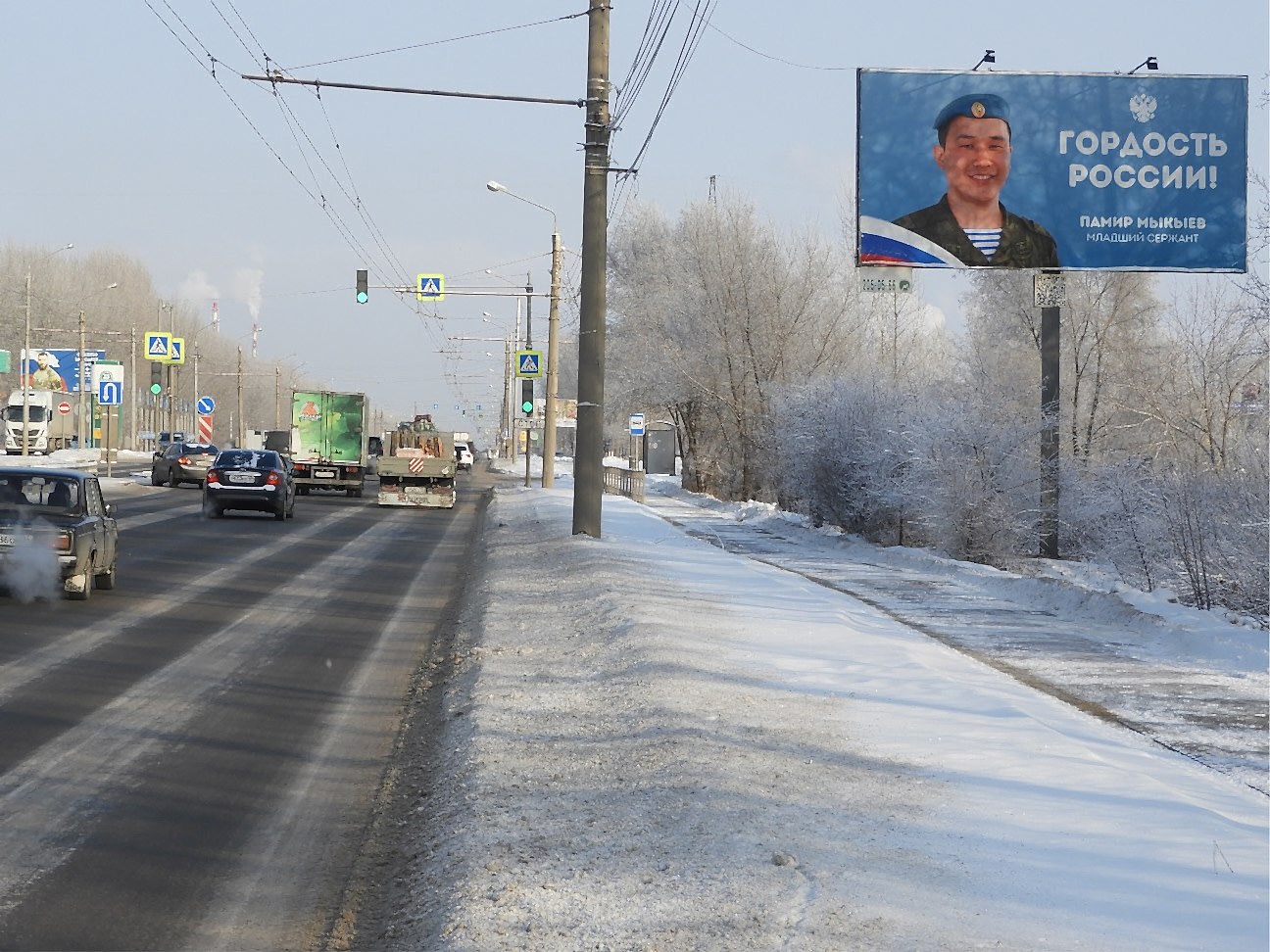 | Рекламная конструкция расположена на очень оживленном участке дороги при движении по ул. Пограничников из Центрального и Советского районов города, в сторону КрАЗа. Рядом с конструкцией расположены: спортивно-оздоровительный центр «Сокол», Красноярское предприятие магистральных электрических сетей ОАО «ФСК ЕЭС», автосалон ООО «СИАЛАВТО», автоцентр «ПАРУС», ООО «КиК комплект», транспортные, Красноярский алюминевый завод ОАО «Русал Красноярск», группа компаний «Монолитхолдинг», автомоечный комплекс «Lucky»торговые и строительные компании, сети быстрого питания и т. д. | есть пешеходный переход 60 метров | Направление движения:сторона А- охватывает потоки движения сул. Достык, 4пр. Достык, Пинап Абая, 91. | Отсутствует | Отсутствуют |